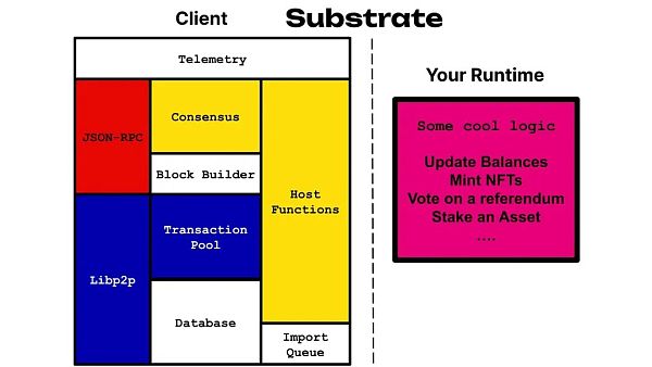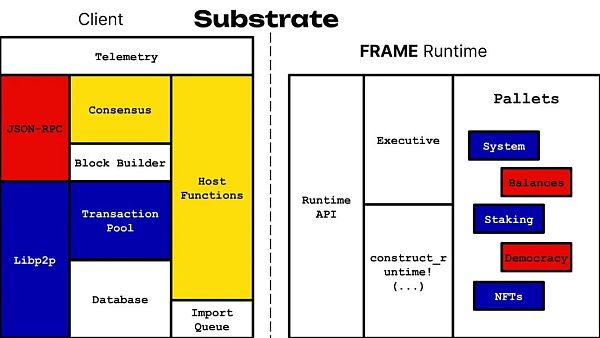 需要注意的是,如果您所在团队的业务解决方案是提出一种新颖的共识算法(Substrate 的共识主要在节点端),那么您可以利用 Substrate 代码的通用性来手动编写自己的共识算法。AlephZero 就是这样做的。他们有自定义的最终性(finality),基于 DAG,并且有一秒的区块时间…所有这些都使用了 Substrate 框架。