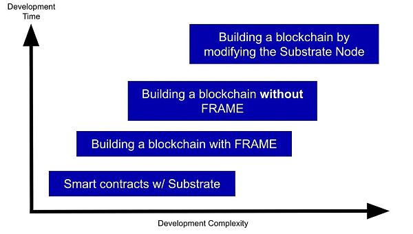 最佳选择是使用 FRAME 构建区块链。然而,构建区块链可能并不适合所有用例,在大多数用例中,编写智能合约就足够了。同时,使用智能合约实现业务用例的开发复杂度最低,并且可以在短时间内完成。