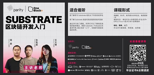 在了解 Substrate 的独特优势和开发特性后,你是否也想开启波卡生态的探索之旅?OneBlock+ 与 Parity 联合开办的 Substrate 入门课程第 15 期已经为你准备好了完整的学习路径和专业指导!