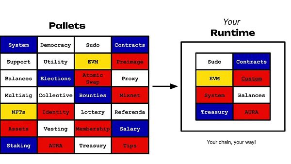 通过 Substrate,开发人员可以完全控制他们想要构建的应用程序。开发人员可以从大量开源 pallet 和模板库中选择预定义的应用逻辑,以加快他们的开发时间。如果在当前库中找不到所需的内容,那不是问题,反而是构建定制 pallet 的机会。