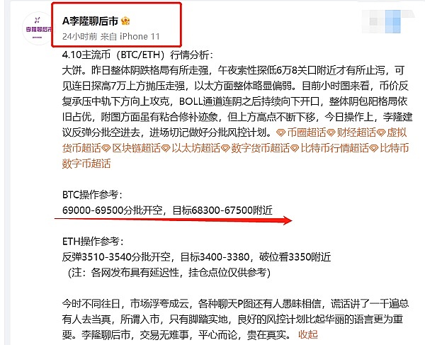 大饼。如李隆昨日午间所说,69500附近补仓空,晚间如愿触及67500附近,短线目标成功扫盈,看空思路走出2000余点的把握空间,实力番苍,全网见证!点位依旧精准吻合,盘中理性稳健取舍。李隆聊后市,交易无难事,平心而论,贵在真实。