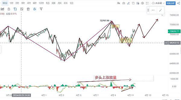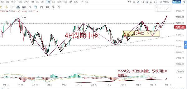 行情解析;在4月8日BTC向上走收敛中枢震荡突破后价格一度触及72800一线, 隔夜后行情开始整理,之后于4月9日欧美盘再度出现下跌,最低接近67500一线。结构上频繁小转大,转势之后又无法延续原趋势,基本毫无规律或者结构而言。这对于短线操作来讲无疑加大了难度。但由于日周期附图指标macd空头红色能量延续缩量,同时双线于0轴上方粘合有形成金叉迹象。另一方面我们从3月20日低点60777,4月3日低点64500以及昨日低点67500附近来看其整体呈现底部抬高的迹象。