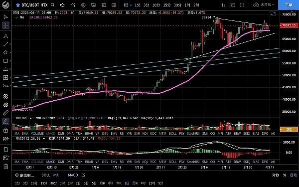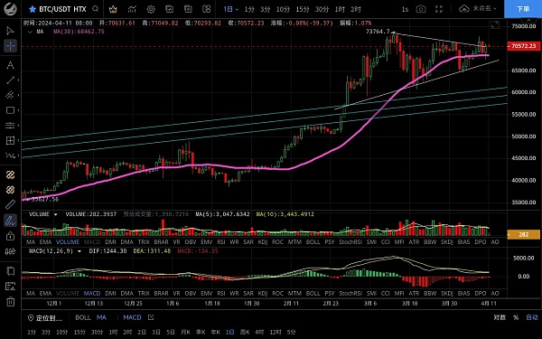 大饼昨日最低跌至67540一线迅速反弹,随后行情一路上行最高触及71130一线受阻,恭喜跟上思路的朋友多单获利三千点,目前币价在70600附近运行,四小时级别k线收针反弹走出三连阳,价格重新拉回7w上方,可见下方支撑较强,macd空头缩量双线粘合走震荡,短期高点降低有回落需求,若价格能站稳70800上方则有再次上涨的可能,日线来看冲高失败加长震荡周期,但身处牛市上涨是长期,结果一定是向好的,思路保持低多不变,上方压制71500-73300,下方支撑70000-69000