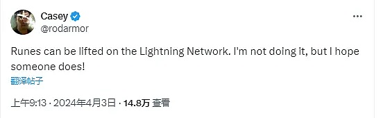 2024年4月3日,Casey 发文表示 Runes 符文在 Lightning Network /比特币闪电网络,是可以有所提升和拓展的!