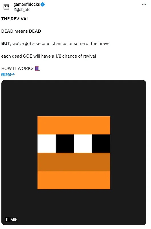 第二阶段“合并期“开始前,项目方又出新花头了,死去的 GOB 铭文(DED GOB) 可以复活。每个死去的 GOB 铭文复活概率为 1/8。