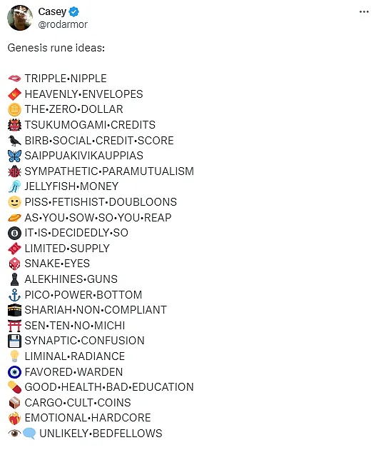 2024年4月2日,Casey 发布了 24 多个关于创世符文的名称想法。