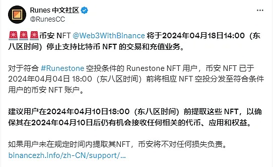 2024年4月4日,Runes 中文社区发文宣布 币安 NFT Binance Web3 将于2024年04月18日14:00(东八区时间)停止支持比特币 NFT 的交易和充值业务。
