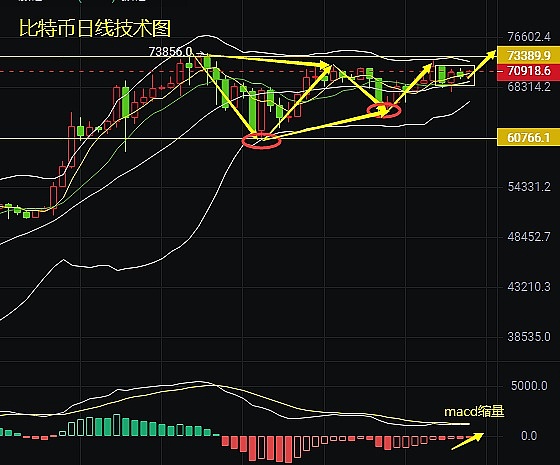 比特币行情分析:日线上看大饼依然保持着多头趋势,但是整体仍是处于三角形区域中调整,唯一的亮点就是处于调整区域的顶部,随着BOLL呈缩口状态,爆发式的行情只需要一个指引点。小时线上看币价站稳70000美元关口后,依托于此保持震荡上行,短线多头也有望冲击一波,上方关注71500美元一带阻力,下方则需关注69500美元一带支撑,交易上保持低多辅空思路进行。