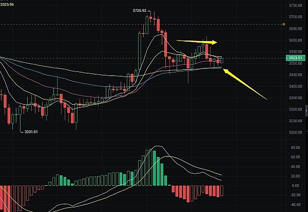 4小时MACD能量开始缩量,DIF继续向下扩散,说明市场还是有回调的需求;