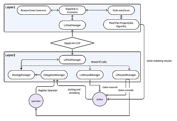 节点运营商可以接受任意 Staker 质押 ETH/WETH,Staker 质押的 ETH/WETH 满 32 个或者 32 个的倍数时,会通过 DappLink 跨链互操作协议跨链到 Layer1 , 质押给以太坊信标链节点,同时铸造 DETH。DETH 又可以质押给支持重新质押的协议。