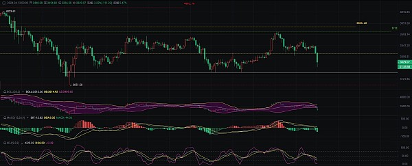 四小时k线目前跌破了EMA趋势指标以后下方出现了真空缺口,尤其是3300到3150区间,守不住3150的话就要重点关注三月二十号的最低位3050支撑(俗称牛熊转换点),如图所示K线已经跌破了布林带下轨支撑3400,加上MACD缩量以后DIF跌入0轴,和KDJ向下开口趋势,几乎所有的指标都进入了空势,这样的情况下只有顺势而为才有利可图