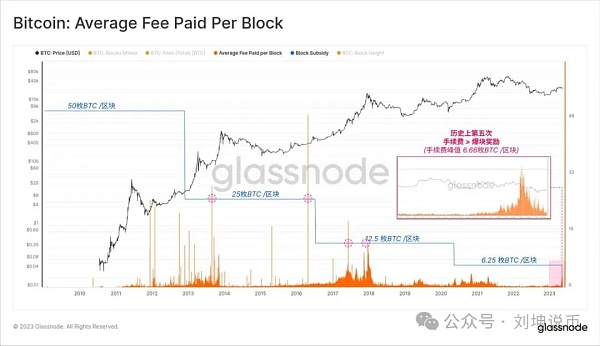 最近一次在 23 年 BRC-20 狂热期,每个挖矿区块的平均手续费是 6.66 枚 BTC,这使得每个区块的总奖励达到了 12.9 枚 BTC 币,远远高于挖矿的 6.25 枚。催生了矿工远远不断的动力!