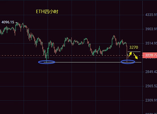 以太坊,一直是反弹乏力下跌给力的状态,所以昨日的下跌中,跌幅明显超比特币,且直接破前低支撑3200关口直接探底3月20号的低点,日线在这个位置,其实存在的变数就是会不会形成双底的支撑形态,因为比特币即便昨日下跌日线的结构也没有发生实质性变化,这也导致以太坊很难独立破位下行;四小时日内需要关注两个位置,第一是3200,如果币价不能反弹持稳在此位置上方,下行的风险将继续增加,第二3270,此位置也是日内如果要去做空最好的切入点,根据昨日的大跌,日内修正调整的概率较大,不排除反弹可能,所以操作上低位不去追空,反弹做空,同时下方支撑位附近可尝试布局多。
