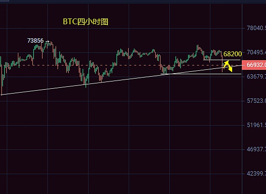 短线上,昨日下跌超6000余点,对于近期连续的弱势震荡走势而言,的确算得上是大动作,但放眼今年的整体短线波动,也只能是中规中矩;日线支撑前低点64500,此位置能不能破才是空头短线能否延续的关键;日内,昨日大跌后短线白盘自然先做空看延续,但是不要去追,一般这种大跌后存在修正需求,所以日内很有可能会走一个探底反弹的走势,四小时转换位68200一线,日内反弹触及可空,下方支撑先看65000关口,回踩此位置多。