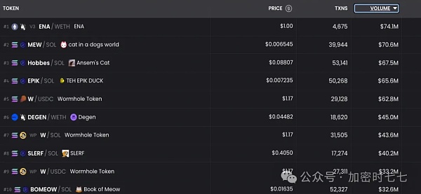 Memecoin市场正在变得庞大——目前,排名前十的Token总市值已超过500亿美元。Memecoin的链上交易量非常惊人——Solana上每日超过10亿美元的交易量主要来自Memecoin。只需随时查看Dexscreener上的前十名Token: