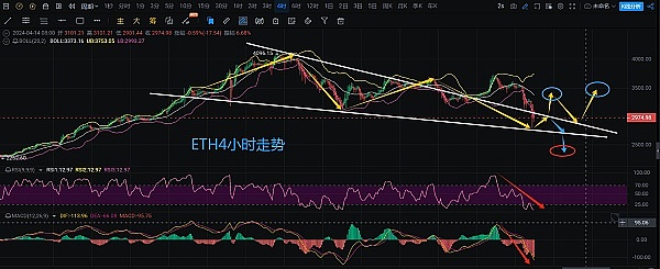 4小时ETH走势,形成了下降三角形态。由顶部4097附近回调至2786接近1300点额大幅度回调。如图三角形态结构来看,回调还没有结束迹象,大的回调走势还会延续,抄底尽量延迟进场
