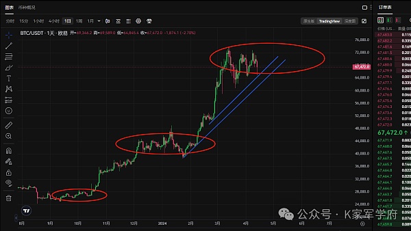 BTC目前的行情在周线级别上出现的一个宽幅震荡的行情,有点类似去年12-1月的那个时间震荡,只是那会的震荡行情是一个比较小的幅度,因为当时的价格比较低所以走势就看起来就那么小阴小阳,现在的价格在历史新高之后大家看起来K线的走势就是大涨大跌的幅度,很多人怕套在山顶,按照现在的价格确实不建议去进场BTC,因为上方的空间有限,风险大于收益指,所以现在可以考虑的就是那些底部没涨的山寨,同时也不建议去做那些已经涨幅很大的山寨,因为一旦进场很容易进到山顶上被套,还有一些新的币子上线多少倍的,目前BTC的行情走势周线级别上出现的宽幅震荡行情,按照现在来看目前64000点一直都是很硬的一个状态,市场怎么低迷怎么试探都是很难去破位的,上方的空间多次去试探72000点压力,但并不能去进行冲破站稳,所以导致目前的行情出现一个震荡的环境区间,看周线我的理解就是在下周就会走出目前的一个趋势环境,去突破并站稳72000点打开上方的一个空间值,等待后续突破并去站稳72000点一线,行情可以直接看到更高,历史新高的第一步目标就是看到片76000-80000区间。