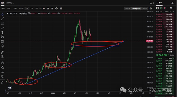ETH的行情也是一样,在出现4000点之后行情低迷,尤其今年一直炒作的升级,很多人说给BNB升级了,为什么BNB这么强势是有原因的,去年我就强调过,今年会有很多上新,内部问题解决之后对BNB来讲就是一个大的升值空间,也会有人想要把BNB的价格做上去,把这个价格坐上去之后,大家可以去想想原因,这个就不用去强调了,现在可以看看ETH的行情,昨天的一根针行情跟3.20号的插针形成一个插针双底部,目前看32000还是能不能持续的站稳,后续去反弹的时候能不能打开3600-3800这个区间值,尤其是目前的3800的一个位置只要进行突破并站稳的情况上方的空间才能打开,同时我们在下周也是要去看3600-3800的这个区间,目前处于一个3200的位置附近,按照不能进BTC的行情来讲,ETH是完全具备可以进的一个价值比的,所以现在进ETH是一个不错的选择。