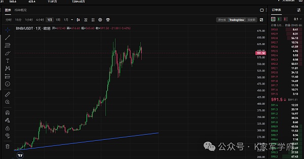 现在可以看看BNB的行情,我们是前期在去年200多的价格一直在进行埋伏也是进场看到600美金也是前期的一个高点位置,现在在600多的位置一直不能进行强势突破达到更高点,后续是可以看到800-1000的目标点位的,但是很多币就是会遇到一个瓶颈一样的,在这里的阻力位形成,就是有人在背后的偷偷的出货,后面就是等待一个高点出现市场FOMO的情绪我们才可以进行出逃,所以现在的BNB上方还是有一定的空间,先不说一倍的空间吧,至少30-50个点的空间是有的,所以大家自己把握行情即可,现在的上新,只要你有BNB都可以得到这个,所以BNB的价格不会下跌很多,这方面大家放心即可。