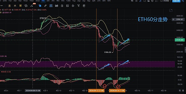 60分ETH走势中,价格K线在布林带下轨道形成支撑反弹至当前上轨道3160附近,短期走势多头如果继续延续震荡走高需要有效突破上轨3160附近阻力,否则将会冲高回落至3076-3010区间