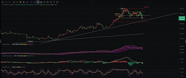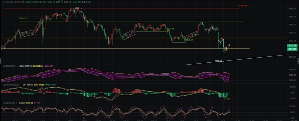 截止发稿前以太坊现价3120附近,昨日K线最高3175附近,最低2900附近,整体趋势出现扳回,多空出现缺口,空闲开盘站立在EMA90趋势线3135附近,一般日线EMA趋势指标出现三大指标交替都属于大行情了,如果出现四线交叉的情况那就属于洗盘清算阶段,受到昨日行情的影响,今日KDJ向下扩散受阻开始收口,MACD出现一大一小的缩量指标,只要暂时不出现金叉就不需要太紧张,主力也没有明显增筹,只有DIF和DEA在缩量指标内向下扩散,K线扳回以后回到了布林带内,位于下轨支撑3050之上,那么思路上可以关注回踩点3050不破就可以继续布局了
