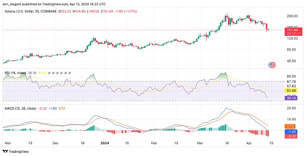 与此同时,Solana 的 SOL 代币从看跌轨道中恢复过来,在过去 24 小时内显着飙升 6%。尽管 Solana 表示已达到 259 美元的历史高点,但其价格从 200 美元以上回落至 132 美元。目前,Solana的价格定为 148.96 美元,尽管近期大幅上涨,但周跌幅为 15%,月跌幅为 19%。