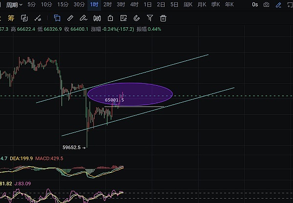 大饼。午夜弱势探低62500附近后持续走窄幅整理,早间企稳63000上方有所发力,涨幅一举吞没昨日起跌点,目前重回66000上方开始横盘,昨日李隆强调的联动吃空也是再度拿下!目前小时图来看,币价反复试探上轨有所承压,连日多次失守下轨却能稳固收回,附图方面金叉结构尚未减弱,则今日思路需由空转多,今日操作上,李隆建议围绕中轨防守,回踩去分批多一次,进场切记做好分批风控计划。