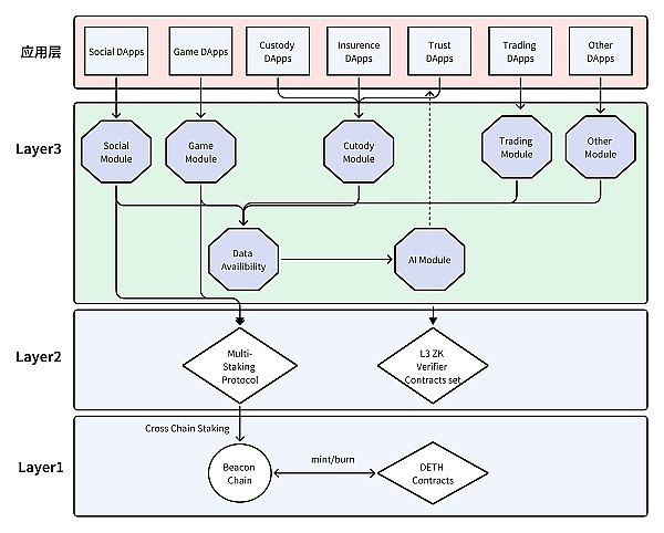 L3 AppChain 通过模块化, 可组合的设计方式支撑上层业务场景,根据不同的业务场景设计去共识,弱共识,强共识和去 EVM 等,由 LinkLayer 多重质押协议模型来保证各个模块的安全运行;AppChain 运行在 L2 上以减少成本。根据上层业务场景开启不同的模块为其服务,像玩乐高一样可以自由组合。同时,AppChain SDK 将提供傻瓜式的上层应用接入模式。当然,上层业务产生的数据进入 DA 层,可以根据不同国家,民族,文化对这些数据进行分类整理,做为 AI 大模型训练的数据源,这也是 AppChain 的很大的价值点之一。也就是说,DappLink AppChain 的这种设计模式具有一些优势: