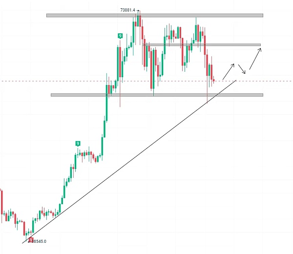 前天比特币价格刺破6w,且快速收回,最低价回踩到了中期上升趋势线,出现拐点,但不排除再次回踩,此线是维持趋势良好运行的最终防守,如果下破,情况可能会比较糟糕。但只要维持在箱体内调整,且形成上升中继,那么下一个趋势高点,最终可能会去测试外延线,或等距段上涨,那么价格至少去到9.5w。