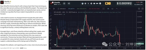 两周前,另一个 AI 流媒体项目 EtherFlix 也在它的「跑路宣言」中将 KOL 抛售代币作为支撑不下去的理由。