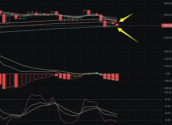 以太坊昨晚破位3210-3190区间,也就是4小时EMA15均线破了,那么历辉就不考虑多单入场,要反手空为主,果然行情在夜间形成两次大回撤,低点在3024处;再看4小时k线即将接近昨日低点,MACD也在放量下行,DIF实现拐头向下,KDJ中J值接近0,那么说明底部下行空间没有多大了,可以时刻关注他的形态转变;