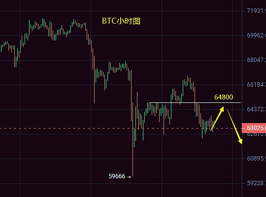 再回看昨日的分析,我们强调现阶段的下跌不是日线级别的反转下跌,日线目前还是维持高位震荡走势,日线区间底部支撑分水岭在60800一线,日线只有通过实体K线的形式有效跌破此位置,才构成破位条件,那日线趋势结构上才能确认破位,其实这种形态的判断就像前期看涨破位73000一样,只是两个完全相反的方向罢了!所以理性分析当前盘面局势,空头触及底部支撑并有过试探,但目前没有破位,而上周区间顶部崩盘下跌后,短线上空头自然形成明显压制,一些场外因素也导致市场空头情绪浓厚,说破位也只是预测,具体还是要根据实际走势才能给出精准判断。