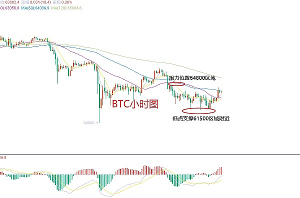 4月17日比特币(BTC)合约技术面分析:今日方面,大周期日线级别昨日报收小阴线,K线形态上连阴单阳,价格在均线下方,均线压力位置在64800区域附近,附图指标死叉向下运行,那么这样来看整体的趋势走势还是比较明显的下跌,所以今日交易上我们还是主空的思路;短周期小时图凌晨回撤低点在61700区域附近,今早延续上涨高点64450区域附近,当前中阳拉升后有承压迹象,K线形态连阴,但力度不大附图指标金叉运行,那么日内还是要观望了,等反抽后再空,因此今日BTC短线合约交易策略:反抽64400区域附近空,止损64800区域,目标看63600-63400区域;
