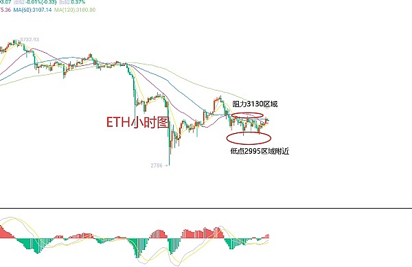 4月17日以太坊(ETH)合约技术面分析:今日方面,大周期日线级别昨日报收小阴线,K线形态上连阴单阳,价格在均线下方,附图指标死叉运行,那么在大趋势上是很明显的下跌优势的,但大家还是要注意数据和消息面带来的影响,所以风险一定要有意识的控制好;短周期小时图凌晨低点在2995区域附近,这是当前的主要支撑位置,高点均线阻力在3120区域附近,当前价格承压K线形态出现连阴形态,但力度还没有出现明显的迹象,所以不能直接空,因此今日ETH短线合约交易策略:反抽3100区域空,止损3129区域目标看3040-3025区域