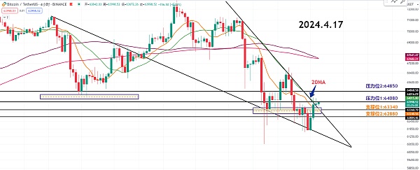 大盘昨日下跌后,目前处于64000的测试区域。虽然4小时图显示下降趋势线已被突破,但目前买盘尚未进入, 4小时级别显示在64400附近形成了阻力区。