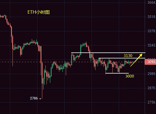 以太坊上周探底2785后震荡回升,目前币价持稳在3000关口上方,日线在触顶后弱势偏下行的走势,短线的阻力压制3130,日内若能突破企稳将反弹上看3200关口附近,短线3030-3060布局多。