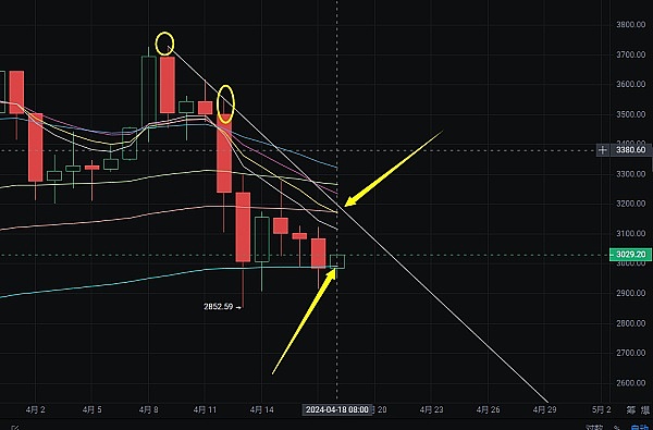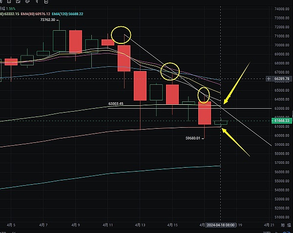 比特币昨日行情跌幅超预期,在日线图EMA60处形成假企稳现象,在美股开盘后再次假冲高形成大砸盘,一举跌破EMA80,突破60000关口,一度造成市场的极度恐慌;再看当前行情开盘价继续回调EMA80上方向上运行,我们可以细心观察到日线币价顶部已经形成平行下移的一个势头,那么我们不得不提防昨日的剧情再次重复上演,还有不到40小时就是比特币正式减半了,我们就更要排除是否在这个消息放出来之前利好已经走完,剩下全是假回调再砸盘,这也是主力常见操作手法,我们一定要留个心眼了!那么我们在这40小时内就尽量以高空入场为主,不做多,谨防被套,避免再次砸盘现象出现!