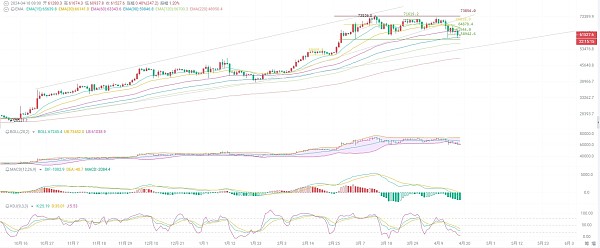 截止发稿前比特币现价61500附近,从昨日最低点到现在已经回弹了一千多的空间,日K线昨日回踩EMA趋势指标59500位,KDJ向下扩散J的数值已经到了6.9附近,MACD结束的顶部背离趋势以后,DIF和DEA昨日也是进入两极分化,今日这两个指标都结束了,DIF和DEA进入了0轴线下方(空头动能强势),布林带开口,K线依旧在布林带下轨支撑61000附近徘徊,