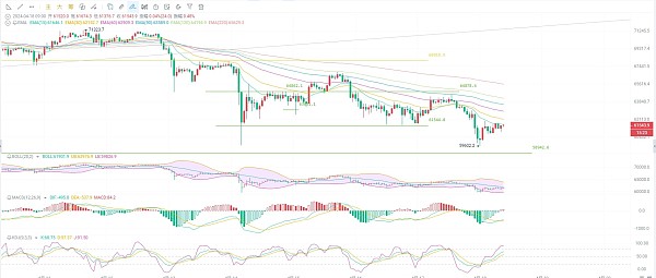 四小时K线可以看到目前EMA趋势指标网状下行趋势接近尾声,KDJ向上形成金叉趋势,MACD底部背离趋势延续,缩量上行增筹,布林带收口以后K线离开了下轨支撑60000,短期内的空势有所延缓,上方关注昨日高点64500附近的压力