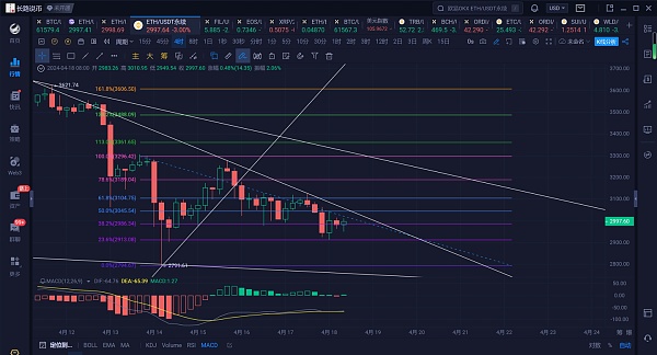 4小时线没行情的一波反弹受到上方斐波那契回撤线0.618处3105附近的压制回踩,昨天晚间更是下跌下方0.236处2915附近支撑反弹插针上方0.5处压制继续震荡运行,从技术指标上看,MACD量能不足,快慢线粘合运行,成交量也萎靡,白盘整体会处于震荡运行的走势中,随着大饼减半行情的临近,行情将会进一步震荡洗盘。众所周知从比特币ETF的顺利上市到行情爆发,大饼减半行情的炒作及ETF消息面的利好走势也有用尽的可能,那么在这个时候减半行情的到来会不会是利好尽头利空?需要在这几天操作中谨慎对待,建议大家如果行情反弹,那么不要一直去追多,带好止损,以小博大。