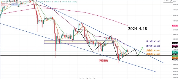 日内第一支撑位关注61650,第二支撑位61000。目前可能会调整至第一支撑位,最大的调整区间可以看到第二支撑。若跌破第二支撑位,那么我看空的观点就会更高,可能会持续到下降楔形的最后部分。