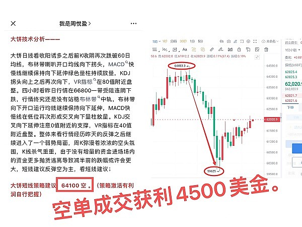 上文策略在64100空,成交后行情回撤59600附近,有4500美刀的空间,悦盈这里只有精确的点位,没有模棱两可的区间和附近之类的,喜欢悦盈的朋友可以点点关注。且看今日分享!!