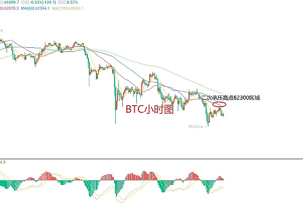 4月18日比特币(BTC)合约技术面分析:今日方面,大周期日线级别昨日报收小阴线,K线心态连阴下跌,价格在均线下方,附图指标死叉运行,那么在大趋势还是很明显的弱势下跌为主,而我们在交易中还是需要注意尽量的短线为主同时要注意反抽的风险,这是必备的交易意识;短周期小时图昨日美盘价格承压下跌凌晨反抽修正,早间没有延续当前二次承压高点在62300区域附近,K线形态连阴,附图指标金叉缩量运行,反弹修正没有力度,而时间也接近欧盘,所以今日要看延续那么欧盘还是要弱势才行,因此今日BTC短线合约交易策略:现价61150区域直接空,止损61500区域,目标看60300-60150区域;