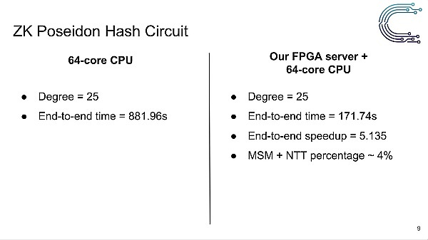 与 CPU 性能相比,我们通过结合使用 CPU 和我们定制的 FPGA 机器取得了实质性进展,但性能仍远未达到最终目标——实时 ZK 证明。