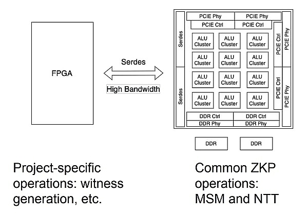 我们在这里想要表达的观点是,硬件需要足够通用,以适应 ZK 算法的各种片上计算操作。这种通用性可以通过 FPGA 和 ASIC 的混合结构实现,正如我们在 2022 年的这条推文中所提议的: