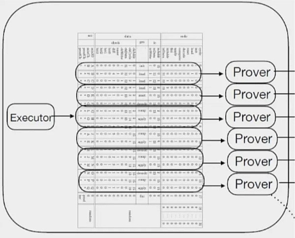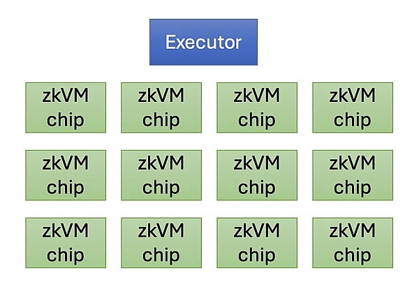 系统的架构相对简单,由一个执行器负责执行程序,硬件负责控制并分配各个“片段(如前文所述)”,以及可配置数量的专用芯片,为每个部分的程序生成 ZK 证明。