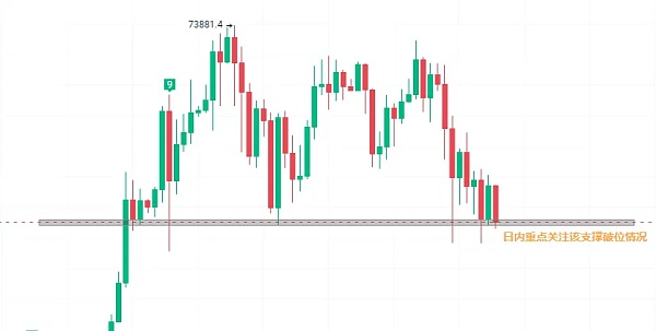 日线级别冲击73000附近回踩到60000,二次冲高不破高点再度回踩到60000附近,这与去年30000附近二次回踩25000走势几乎一致,所以这波在底部持续震荡吸筹,再度拉盘将看到本轮牛市的主升浪,最低目标84000。