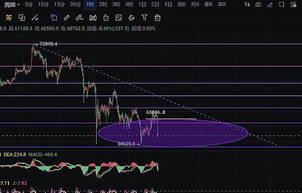 大饼。昨日早间自62000上方承压起跌,午间止泻于60800附近再走反抽,晚间慢性企稳再次突破64000上方,早间又重回低点附近,反复山车的来回洗盘,主力操控手法着实诡异。目前小时图来看,BOLL通道结构走得较为平稳,但早间两根吞没大阴再次探低60500附近,附图形成死叉抛售信号,而伴随减产临近噱头加持,个人认为空间上无疑给到低位吸筹加剧,今日操作上,李隆建议先等修补再去空,下方重点关注5.8/5.5的实体防守,进场切记做好分批风控计划。