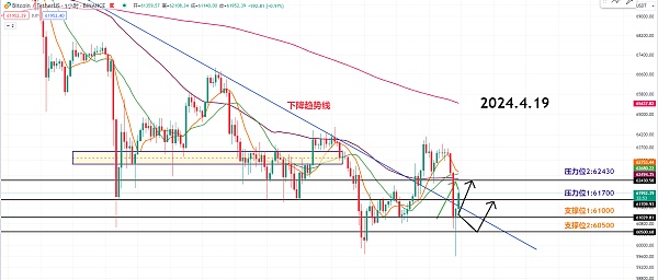 日内关注第一阻力位62000,第二阻力位62430。当行情突破了第一阻力位之后,预计就会重新稳定在更高的低点,可以反弹看至第二阻力位。 但在当前的不利局势下, 对于短线交易大家可以在获利之后先落袋为安,并采取保守的交易策略来应对价格的波动。