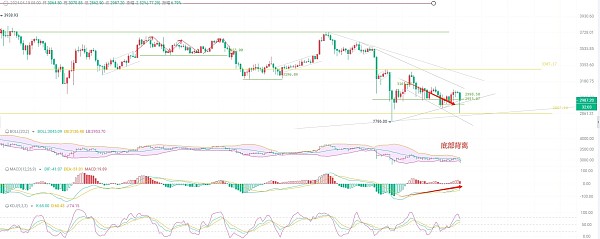 四小时K线目前出现一根很长的下影线,跌破EMA趋势指标以后得回调,KDJ向下收口,MACD放量上行,DIF和DEA距离拉开(表明K线趋势波动较大),布林带收口以后K线跌破中轨3044线和虚破下轨2945支撑点,现在回到下行通道内部盘整,整体趋势上可以看到下方站立虚浮,短期内还有回踩的可能